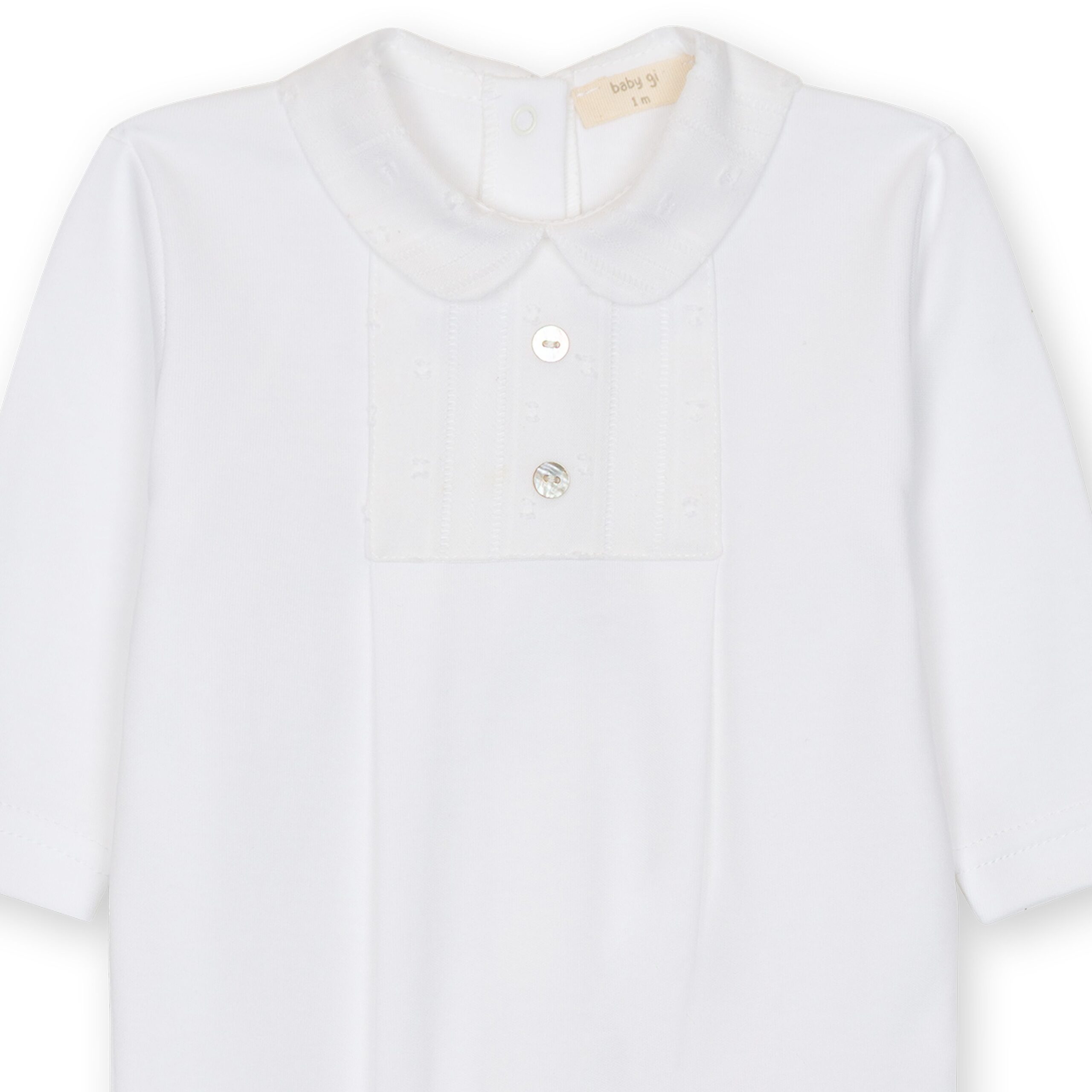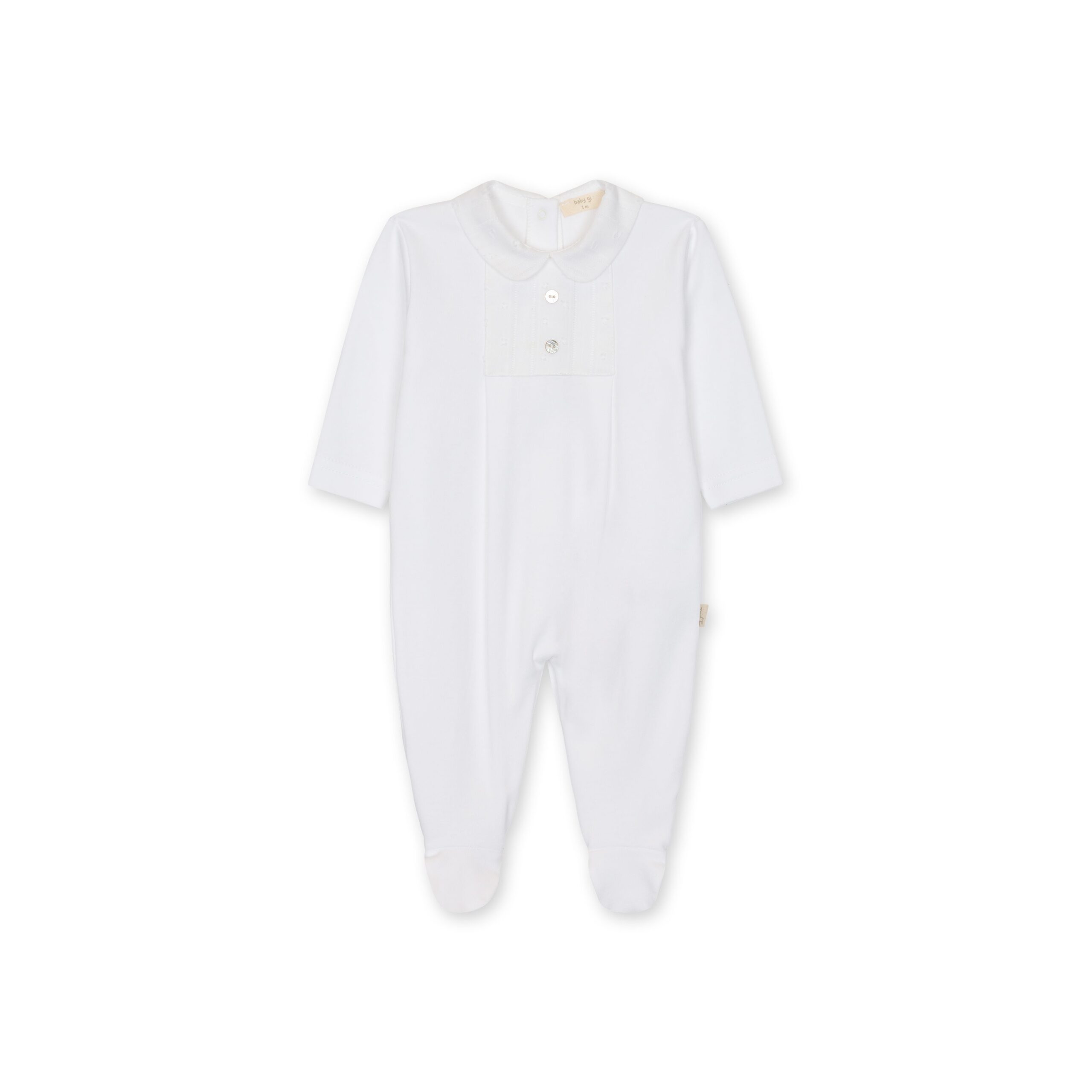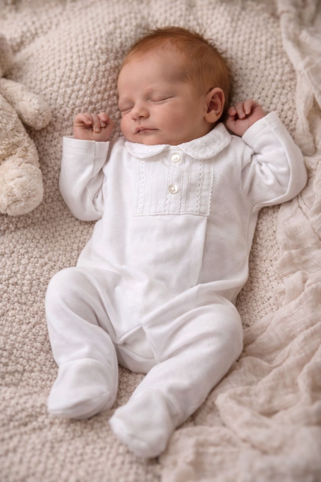 De verfijnde afwerking op de borst – met subtiele plooitjes en elegante knoopjes – geeft het geheel een klassieke en tijdloze uitstraling. De ronde kraag voegt een extra vleugje charme toe, terwijl de lange mouwen en voetjes zorgen voor warmte en comfort van top tot teen.