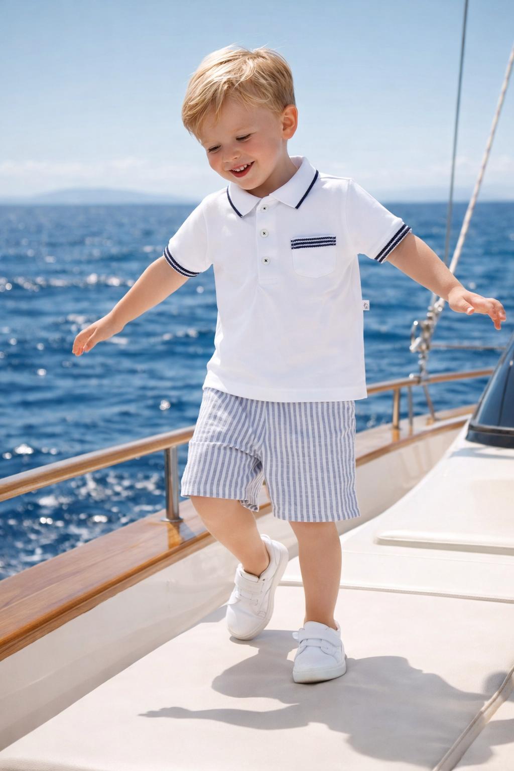 Deze elegante jongensset van Deolinda is een perfecte combinatie van comfort en klassieke stijl. De outfit bestaat uit een wit polo shirt met verfijnde donkerblauwe details op de kraag, mouwen en borstzak. De bijpassende lichtblauw gestreepte short zorgt voor een frisse, zomerse look.
