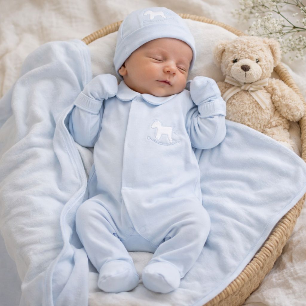 Deze prachtige babyset is perfect voor de allerkleinsten. Het zachte lichtblauwe boxpakje met bijpassend mutsje en wantjes zorgt ervoor dat je baby zich heerlijk comfortabel voelt vanaf de eerste dagen. Het subtiele geborduurde schommelpaardje geeft het pakje een klassieke en tijdloze uitstraling.