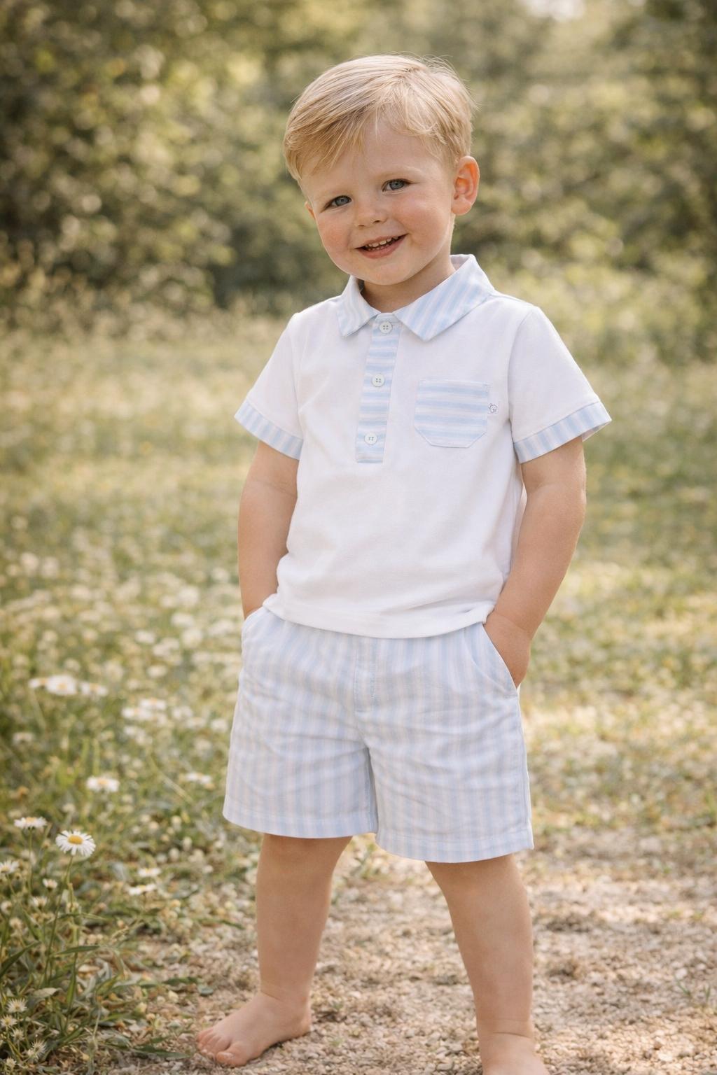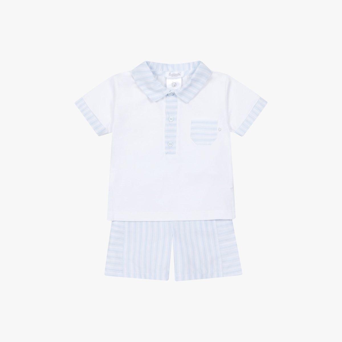 Deze prachtige jongensset van Deolinda combineert comfort met een klassieke, stijlvolle uitstraling. De set bestaat uit een wit polo shirt met verfijnde lichtblauwe details op de kraag, mouwen en borstzakje. De bijpassende short met subtiele lichtblauwe strepen maakt de outfit helemaal compleet.